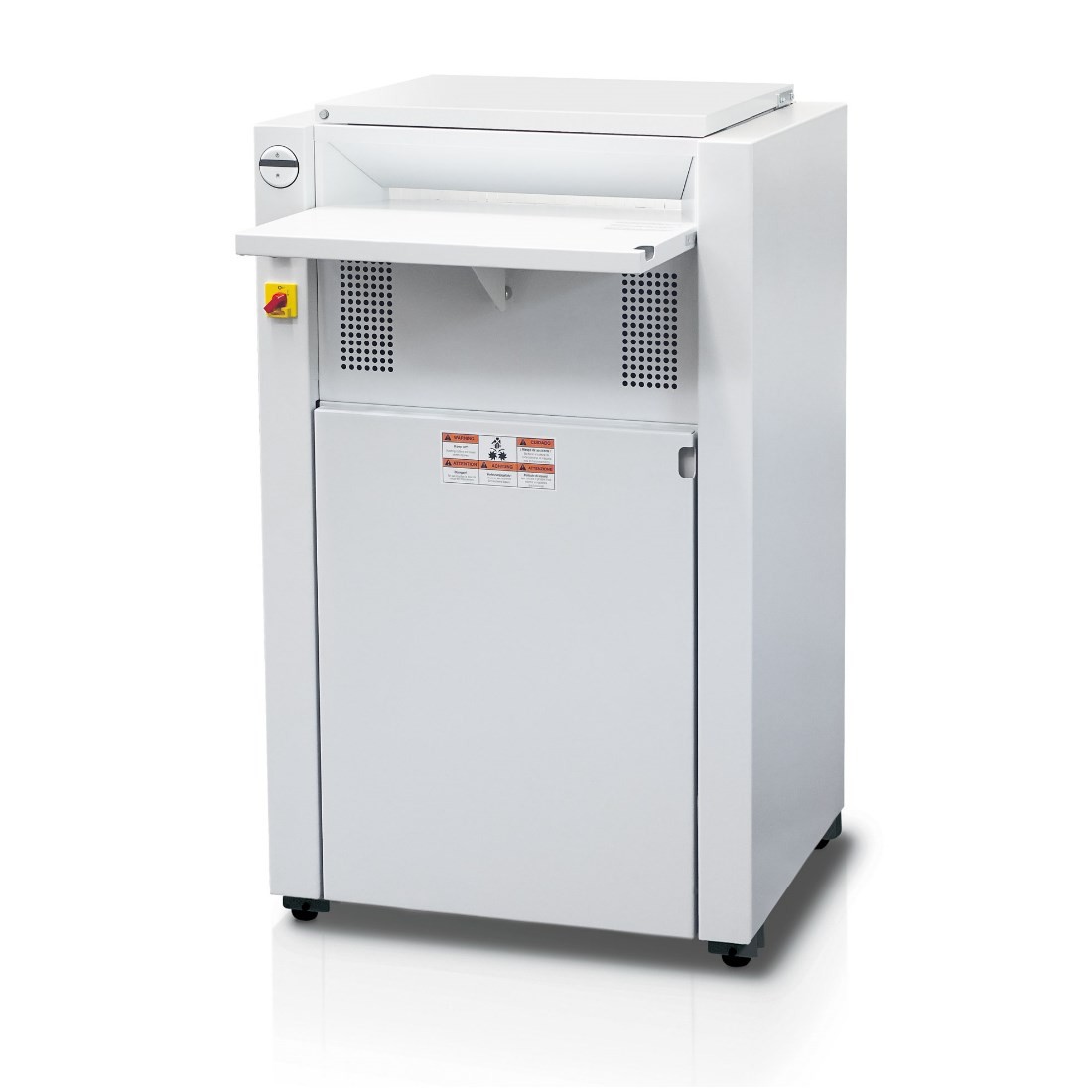 Składany stolik przy szczelinie podawczej. Wyłącznik główny i wyłącznik awaryjny. Wytrzymałe noże tnące wykonane z wysokiej jakości hartowanej stali odporne na miękkie metalowe przedmioty takie jak zszywki czy spinacze. Automatyczna olejarka pozwala na pracę ciągłą urządzenia. Automatyczny tryb bezczynności po 30 minutach pozwala na oszczędność energii. Mocny silnik trójfazowy z zabezpieczeniem przed przegrzaniem. Drzwiczki z przodu pozwalają na szybki dostęp do pojemnika o dużej objętości, a dzięki zastosowaniu kółek pozwala na łatwy transport. Automatyczne zatrzymanie urządzenia po otwarciu drzwi przednich lub po zapełnieniu kosza na ścinki.
